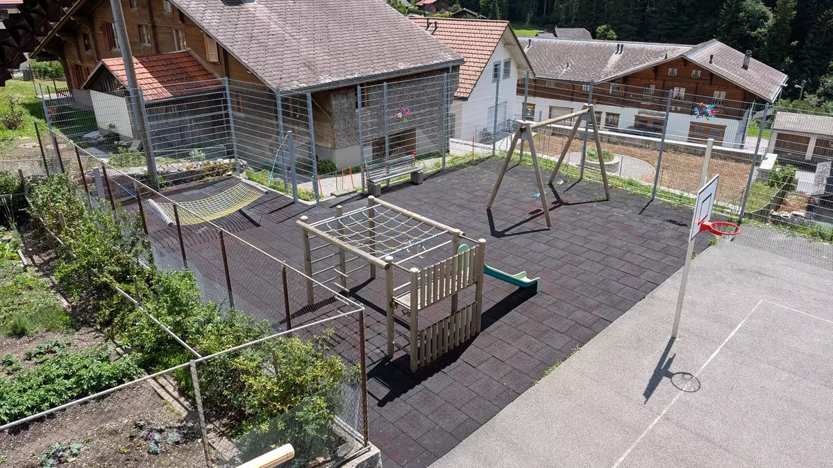 Der Spielplatz beim Schulhaus Jaun lädt alle zum Verweilen ein. Durch den angrenzenden grossen Tisch mit Bänken können die Eltern ihre Kinder gut beobachten.