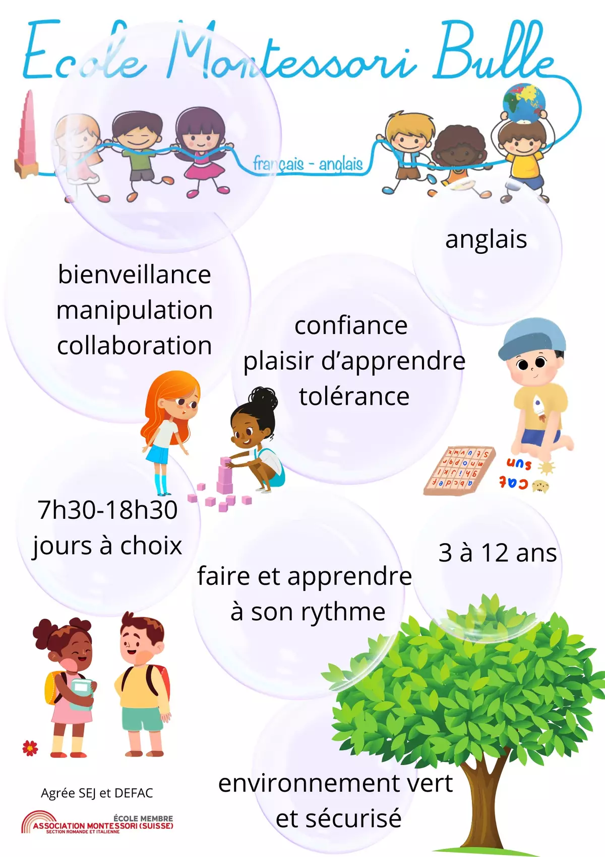 Notre établissement scolaire propose un enseignement suivant les principes de la pédagogie Montessori, pour les enfants de 4 à 12 ans (1H à 8H) avec une initiation poussée en anglais.