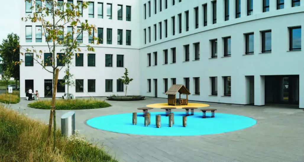 - Revêtements : sol synthétique, pavés en béton, prairie fleurie