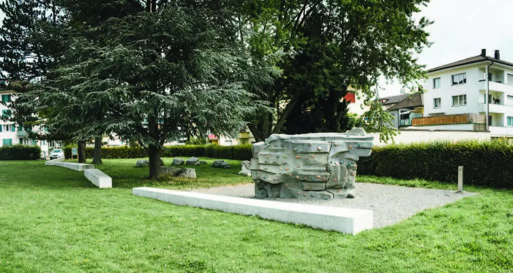 En hommage à l’alpiniste Erhard Lorétan, qui jouait sur cette parcelle étant enfant, cette place de jeux est constituée de rochers pour grimper. Juste à côté, une grande surface d’herbe relativement plane est idéale pour jouer à la balle, courir, faire du cerf-volant, etc. De grands arbres apportent de l’ombre et une rangée de pommiers a été plantée récemment.