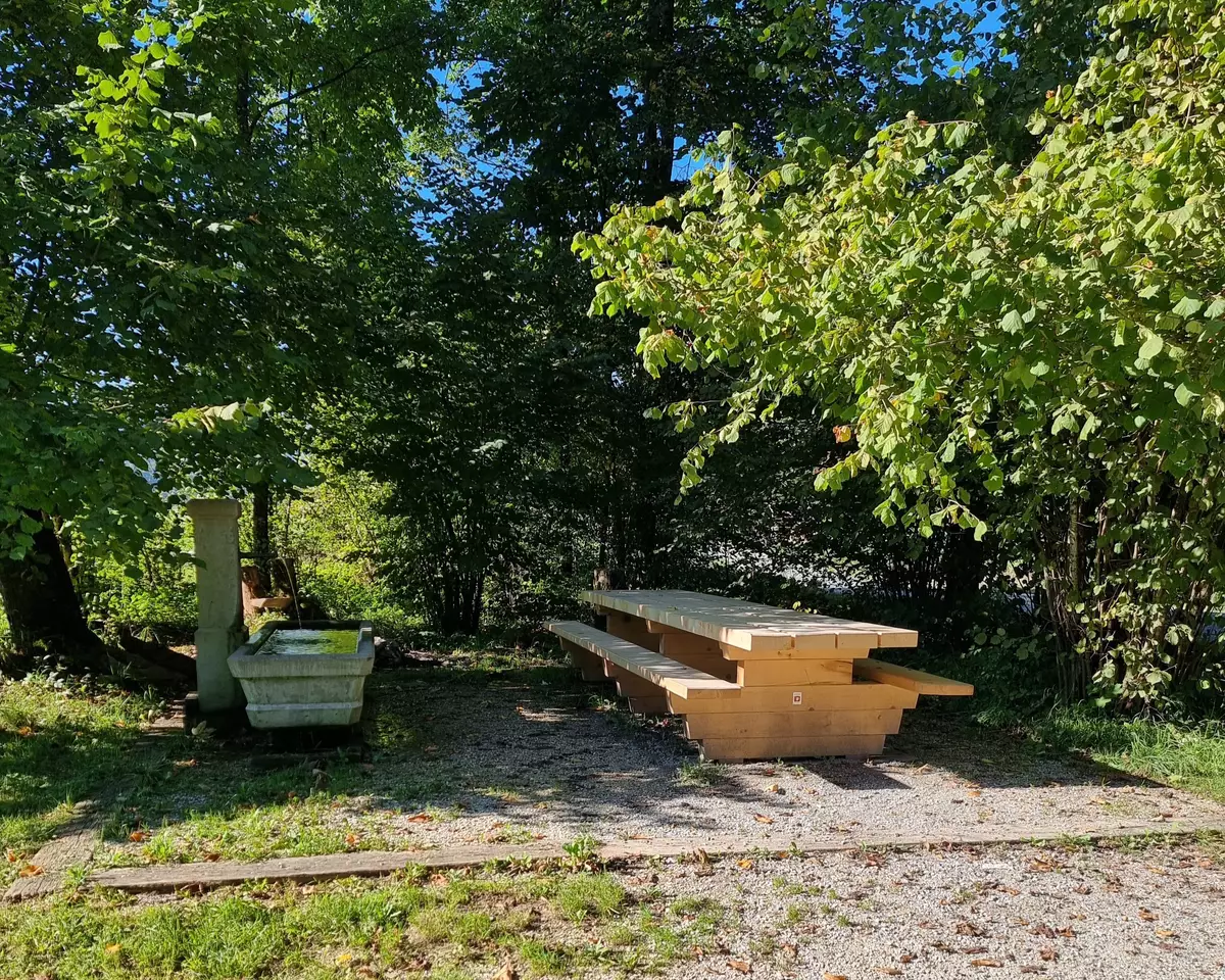 Place de pique-nique avec tables, bancs et une fontaine à disposition.